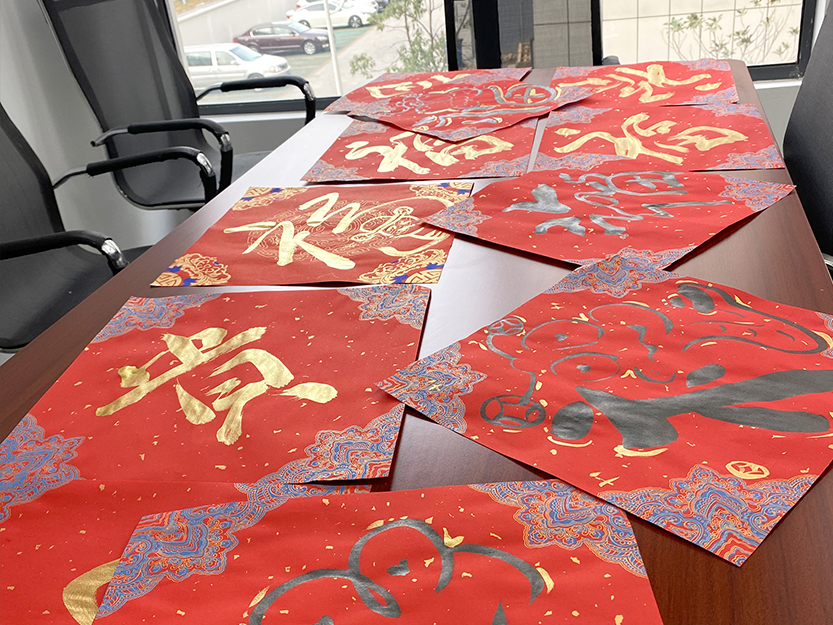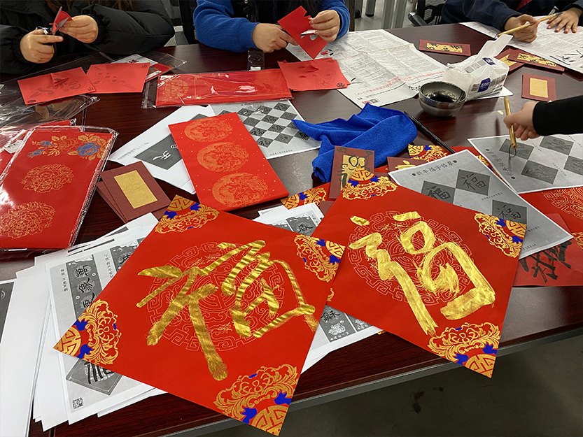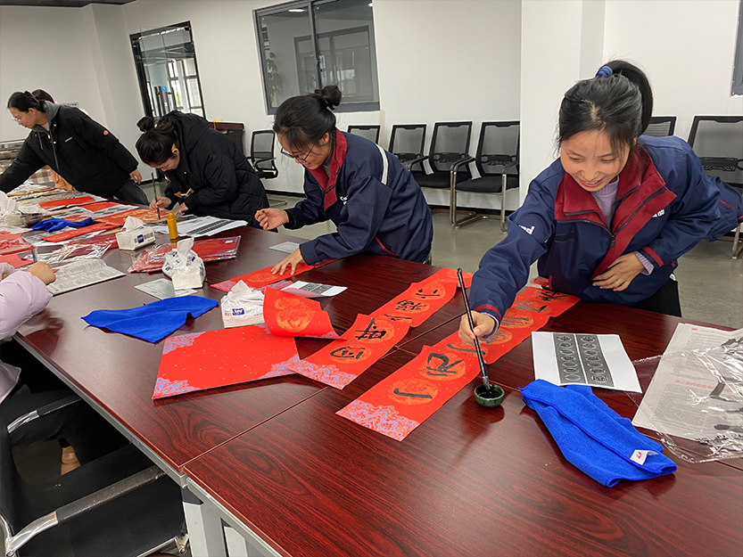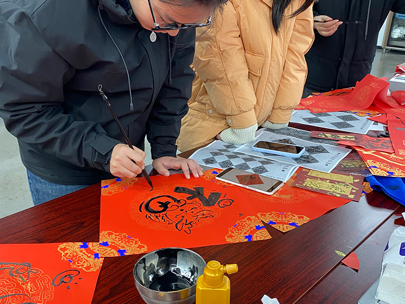 新年不可或缺的就是“新桃換舊符”。紅艷艷的春聯、斗拱紙一字排開,參與活動的大家伙兒們紛紛揮毫潑墨,把對新一年的美好祝福融入墨香里,鐫刻在紅紙中。